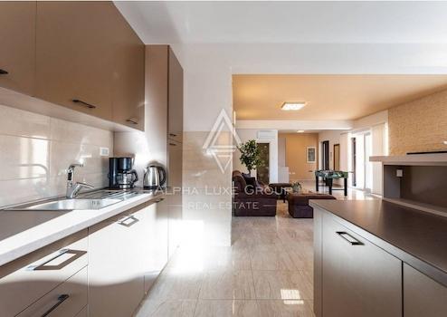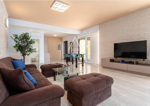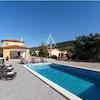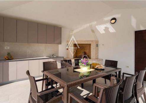 Die 245 m² große Villa erstreckt sich über zwei Etagen und umfasst ein separates 35 m² großes Apartment sowie zusätzliche Einrichtungen. Das Hauptgebäude umfasst 168 m² mit einem einladenden Wohnbereich im Erdgeschoss, der in eine moderne Küche mit Essbereich übergeht und Zugang zu einer Außenküche für den Sommer bietet. Ebenfalls im Erdgeschoss befinden sich ein Gäste-WC, ein Abstellraum und ein Wäscheraum. Im Obergeschoss verfügen drei Schlafzimmer jeweils über ein eigenes Badezimmer und teilen sich einen großen Balkon mit atemberaubendem Blick auf die ruhige Umgebung.