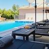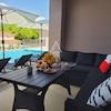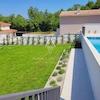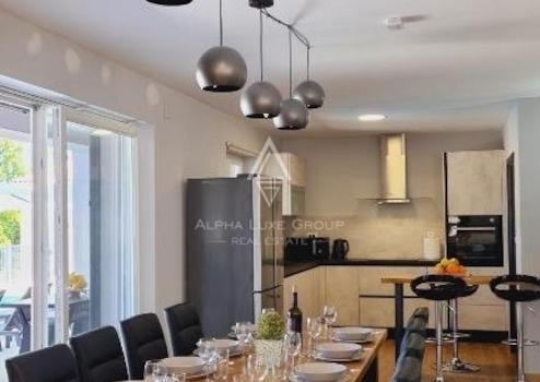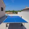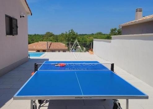 PVC-Fenster und -Türen tragen zur modernen Ästhetik und Energieeffizienz der Villa bei. Draußen wartet ein 38 m² großer Pool, umgeben von einer Lounge-Ecke und Sonnenliegen, perfekt für Entspannung oder Unterhaltung unter der Sonne. Das Anwesen verfügt auch über Tischtennis und ein Bewässerungssystem für den sorgfältig gepflegten Garten, was das Erlebnis im Freien verbessert.
