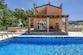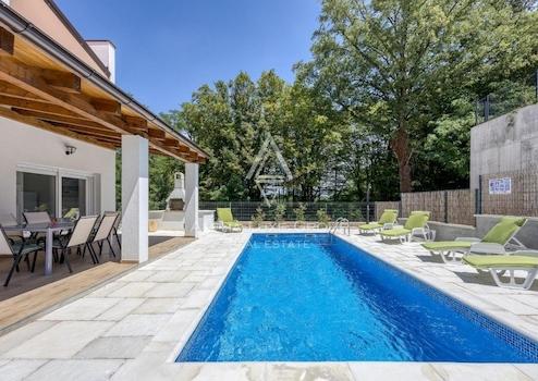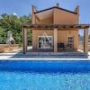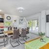 Das Erdgeschoss öffnet sich zu einem geräumigen Wohnbereich, der nahtlos mit dem Essbereich und der Küche verbunden ist, ergänzt durch ein zeitgenössisches Badezimmer. Eine markante Glaswand im Wohnzimmer rahmt die malerischen Aussichten auf die Terrasse, den einladenden Pool und einen Außen-Grillbereich ein. Das obere Stockwerk beherbergt zwei gemütliche Schlafzimmer, die sich ein modernes Badezimmer teilen, wobei eines der Schlafzimmer auf einen privaten Balkon erweitert wird. Ein praktischer Waschraum erhöht die Funktionalität des ersten Stockwerks.