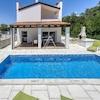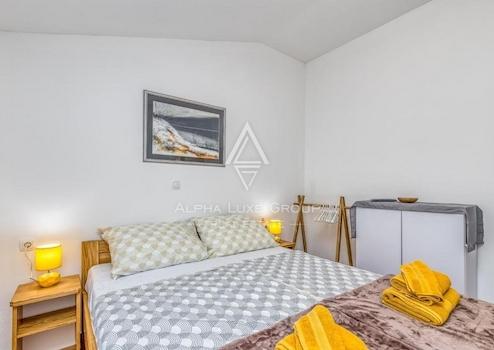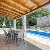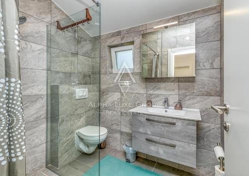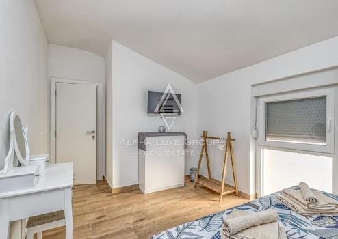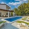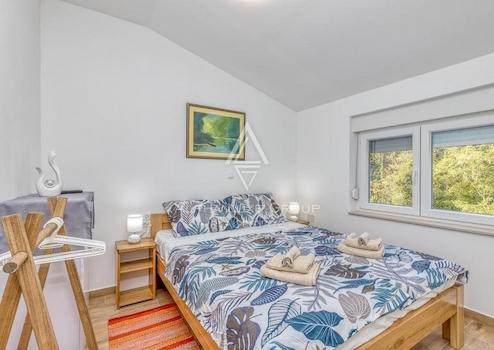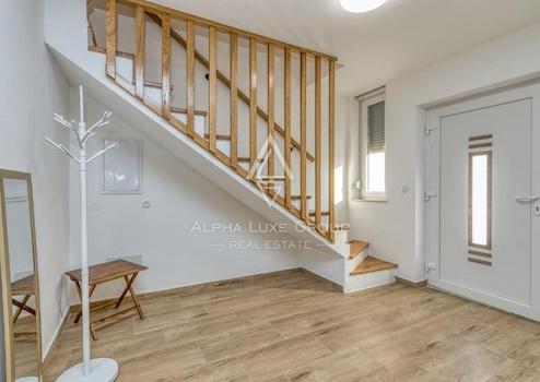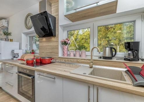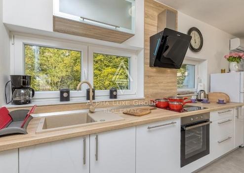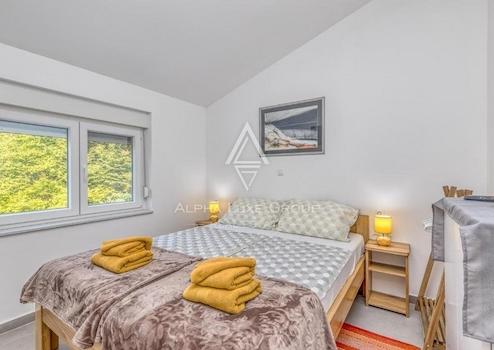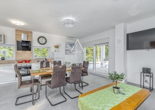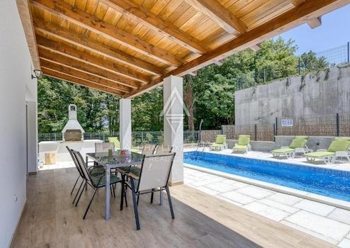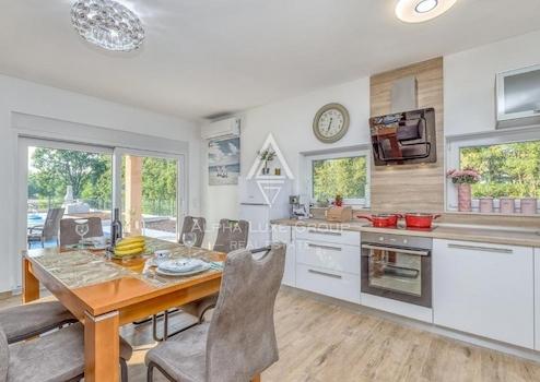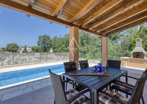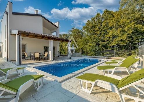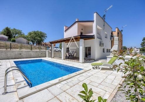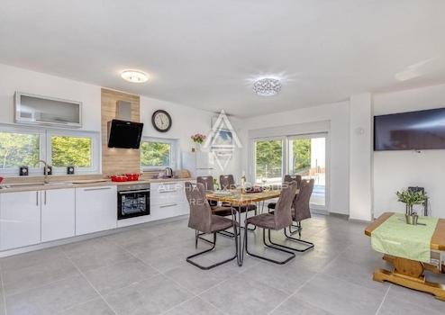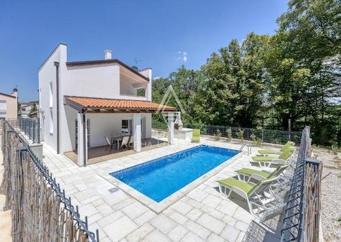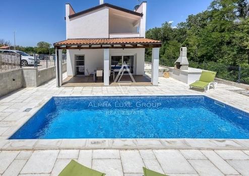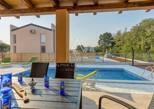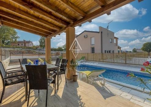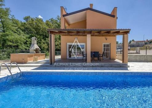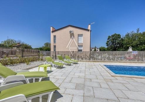 Zum Verkauf steht ein kürzlich fertiggestelltes Doppelhaus in der idyllischen Gegend nahe Tinjan, fertiggestellt im Jahr 2022. Auf zwei Ebenen erstreckt sich das Haus über 84 m² und wird von einem 268 m² großen Garten sowie zwei Parkplätzen ergänzt. Das Erdgeschoss bietet einen großzügigen Wohnbereich, der nahtlos in eine offene Küche und einen Essbereich übergeht, neben einem Badezimmer und einem Abstellraum. Vom Wohnbereich aus gelangt man direkt auf eine einladende Terrasse und in den Poolbereich. Das Obergeschoss beherbergt zwei Schlafzimmer, ein zusätzliches Badezimmer und einen Waschraum. Die Klimaregelung wird effizient durch Klimaanlagen gehandhabt, während die Infrastruktur für eine Pelletheizung bereits vorhanden ist. Verbesserte Wärmedämmung sorgt dafür, dass im Sommer kaum Kühlung benötigt wird.