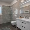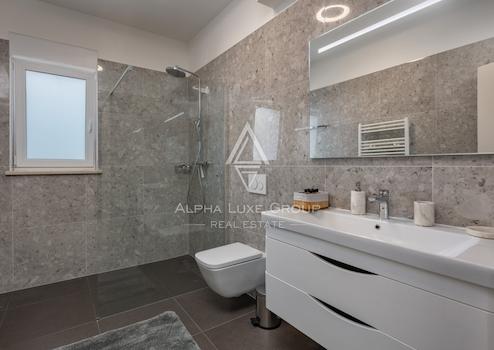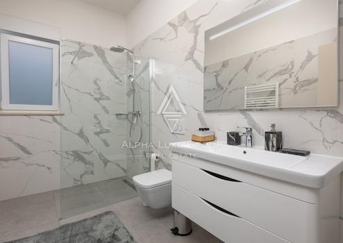 Die obere Ebene umfasst drei Schlafzimmer, jedes mit eigenem Bad und Zugang zu einer breiten Terrasse mit Panoramablick auf das Meer, der an klaren Tagen bis nach Venedig reicht. Das Untergeschoss dient als funktionaler Bereich mit einer Garage für zwei Autos, einem Weinkeller und zusätzlichem Stauraum, alles temperaturkontrolliert für optimale Nutzung.