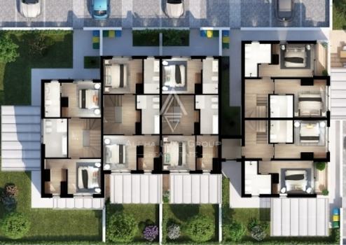 Das Erdgeschoss bietet eine einladende Eingangshalle mit Garderobe, die in einen großen Wohnbereich führt, der elegant eine Küche und einen Essbereich kombiniert. Dieses Niveau ist durchdacht mit einem Wäschezimmer, Gäste-WC und einem Technikraum gestaltet. Glaswände im Wohnzimmer öffnen sich zu einer überdachten Terrasse und bieten ein nahtloses Innen-Außen-Wohnerlebnis, das in den Garten führt. Steigen Sie die Treppe in den zweiten Stock hinauf, wo Sie zwei geräumige Schlafzimmer finden, jedes mit eigenem Bad, eines davon mit einem 6,25 m2 großen begehbaren Kleiderschrank. Im dritten Stock befindet sich ein weiteres Schlafzimmer mit einem en-suite Badezimmer und Zugang zu einer großen Terrasse. Dieses Haus ist mit moderner Fußbodenheizung, einer Wärmepumpe und einer Klimaanlage ausgestattet.