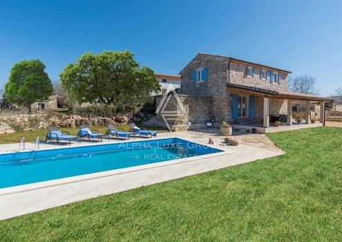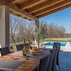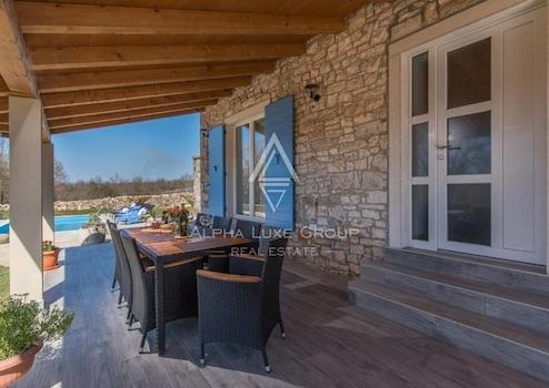 Eine große überdachte Terrasse vor der Villa bietet einen ruhigen Blick auf das umliegende Grün und den Swimmingpool. Der Poolbereich mit Sonnenbadefläche und einer neu erbauten Sommerküche mit Kamin bewahrt das authentische istrische Flair.