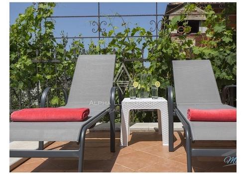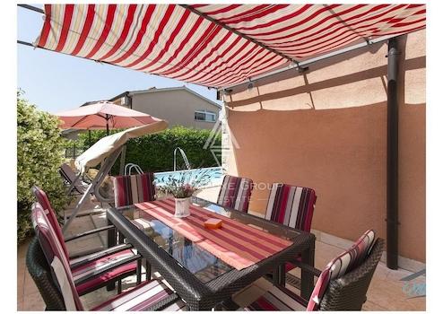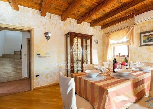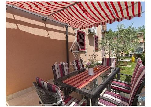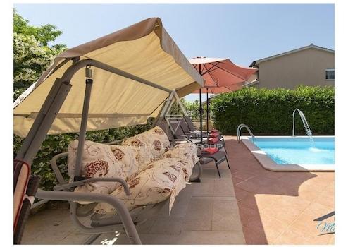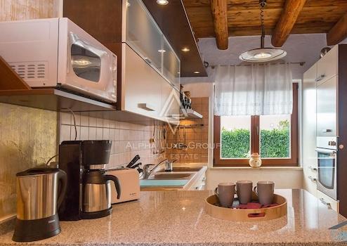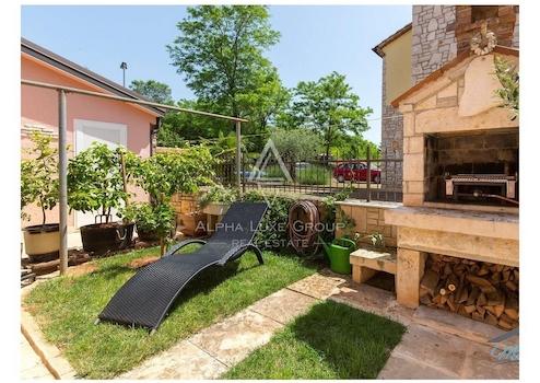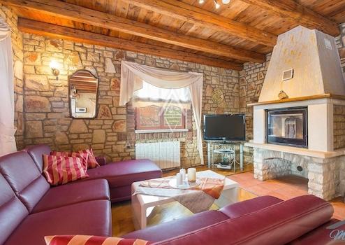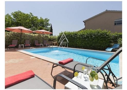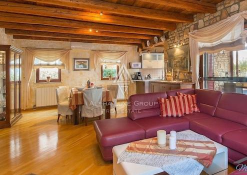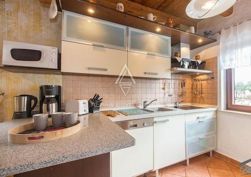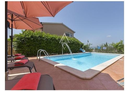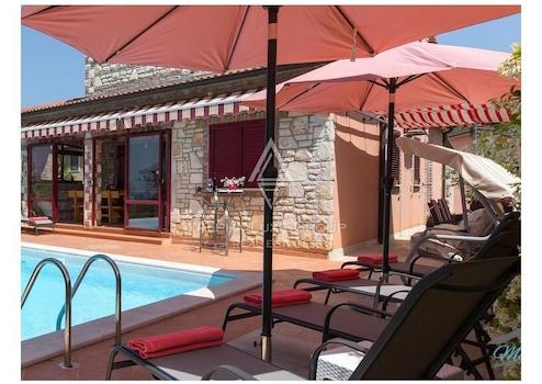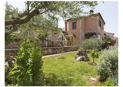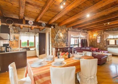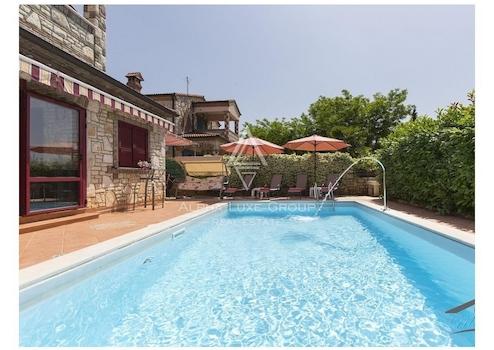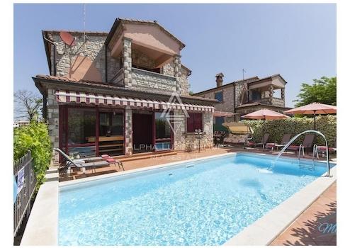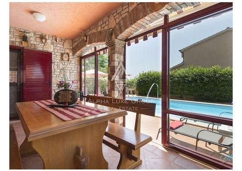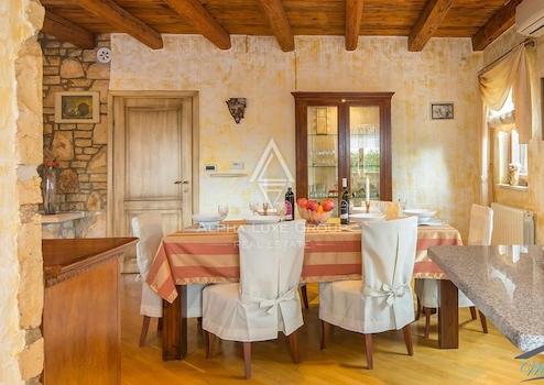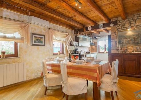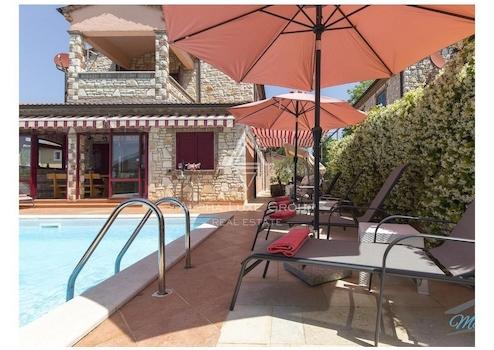 In der charmanten Gegend von Kaštelir in Istrien steht jetzt eine beeindruckende Villa im rustikalen istrischen Stil zum Verkauf. Die Villa verfügt über ein ca. 40 m² großes Kellerapartment, bestehend aus einer Küche, einem Essbereich, einem Badezimmer und einem Zimmer. Der Haupteingang führt in einen Flur, der zu einem gemütlichen Badezimmer, den Treppen in das obere Stockwerk und einem geräumigen Wohnzimmer mit Kamin führt. Der angrenzende Essbereich bietet einen großen Tisch und Stühle, und die gut ausgestattete Küche führt zu einer geschlossenen Terrasse. Der Außenbereich wird durch einen großen Swimmingpool, Sonnenliegen und einen Grillbereich hervorgehoben. Die Atmosphäre im Erdgeschoss wird durch Holzbalken und mit istrischem Stein verkleidete Wände, sowie rote Aluminiumläden und natürliche Holzbalken an der Außenseite verstärkt.