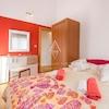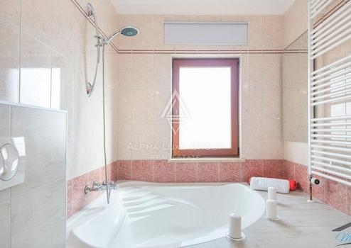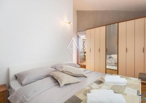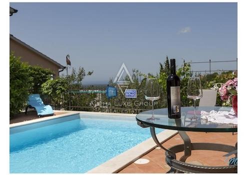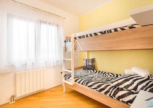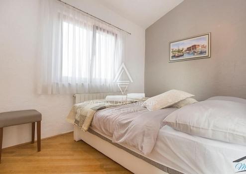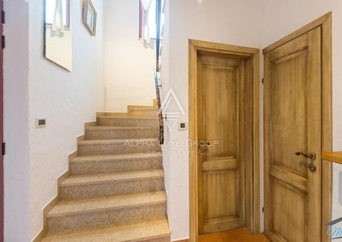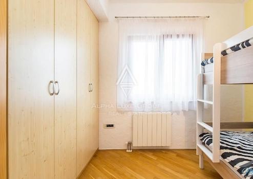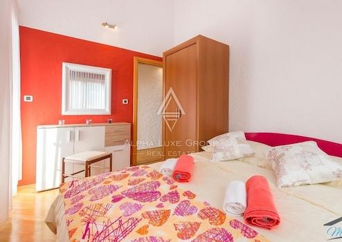 Im Obergeschoss befinden sich drei Schlafzimmer: zwei geräumige Schlafzimmer, ein kleineres Kinderzimmer und ein großes Badezimmer. Jedes Schlafzimmer ist mit TV- und Internetanschlüssen ausgestattet, und der Flur öffnet sich zu einem Balkon mit atemberaubendem Meerblick, ideal für den morgendlichen Kaffee. Ein zusätzliches 40 m² großes Apartment in der Villa verfügt über eine Zentralheizung, eine Küche, einen Essbereich, ein Schlafzimmer und ein kleines Badezimmer. Zur Ausstattung der Villa gehören ein Heizraum mit ölbefeuertem Heizsystem, ein Waschraum und eine geräumige Garage. Abends erhellen ferngesteuerte Lichter die Villa und zeigen ihren einzigartigen Stil.