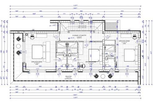 Im Obergeschoss befinden sich drei Schlafzimmer, jedes mit einem eigenen Bad und Zugang zu Balkonen, die einen ruhigen Blick auf die malerische Umgebung der Villa bieten.