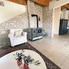 Das Innere des Hauses erstreckt sich über zwei Etagen und vereint modernes Wohnen mit rustikalem Charme, gekennzeichnet durch eine Mischung aus zeitgenössischen und klassischen Möbeln. Das Erdgeschoss kombiniert ein Wohnzimmer, Essbereich und Küche, die alle zu einer überdachten Veranda führen. Ein Badezimmer, Abstellraum und eine 30 m² große Garage vervollständigen diese Ebene. Im Obergeschoss befinden sich zwei Schlafzimmer und eine Toilette.