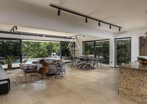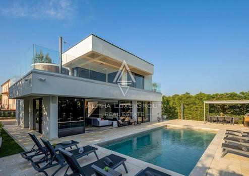 In dem ruhigen Dorf Lovrečica, nahe Umag, steht eine beeindruckende moderne Villa zum Verkauf. Diese exquisit gestaltete Immobilie erstreckt sich über 278 Quadratmeter und ist umgeben von einem sorgfältig gepflegten Garten von 756 Quadratmetern, der ein elitäres Wohngefühl verspricht.