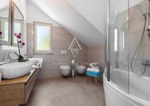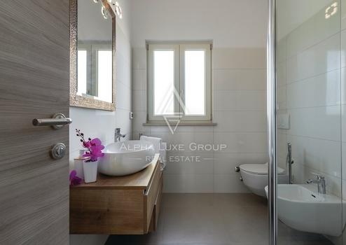 Die Aufteilung der Villa umfasst zwei Wohnzimmer, eine Küche, vier Schlafzimmer, fünf Bäder, ein WC, ein Fitnessstudio, eine Sauna, drei Abstellräume und eine separate Taverne. Der Außenbereich ist ebenso beeindruckend mit einem 35 m² großen Swimmingpool und einer angrenzenden Taverne mit Kamin. Der umfangreiche Garten bietet nicht nur einen Spielbereich für Kinder, zwei Garagen und eine Grillstelle, sondern auch einen Olivenhain mit 120 ausgewachsenen Olivenbäumen.