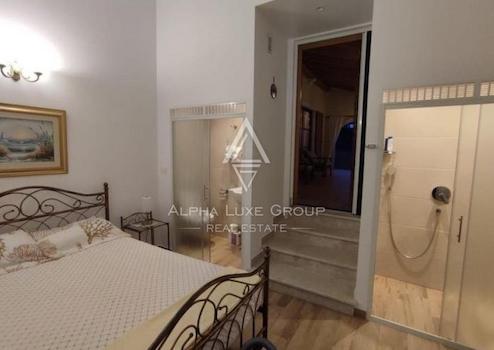 Der wunderschön angelegte und umzäunte grüne Garten umfasst eine Liegewiese, eine Außendusche, einen 32 m² großen Swimmingpool, eine Taverne für geselliges Beisammensein und einen Außenkamin.