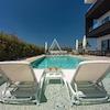 Die Außenterrasse verfügt über einen Esstisch, Tischfußball, eine Sommerküche und einen beheizten Pool von 52 m2 mit Liegewiese und Hydromassagebereich.