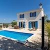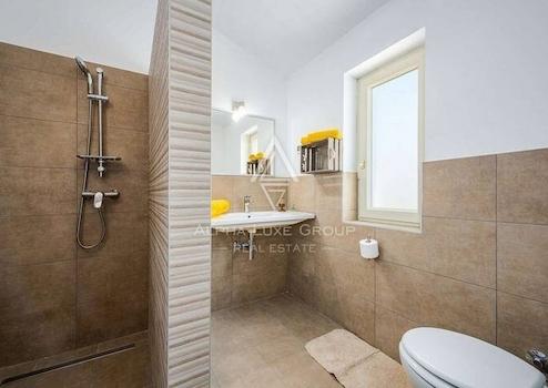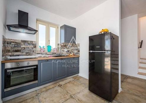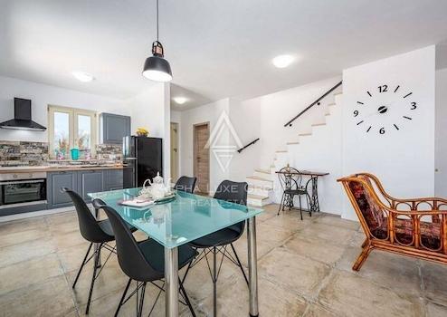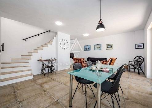 Eine elegante Steintreppe führt in die erste Etage des Hauses, wo sich zwei komfortable Schlafzimmer mit jeweils einem Badezimmer befinden. Die Schlafzimmer haben alle Meerblick. Vom Wohnzimmer gelangt man direkt auf die überdachte Terrasse und den Pool. Jedes Zimmer verfügt über eine Klimaanlage und einen Kamin, in den nachträglich ein Holzofen oder Holzofen eingebaut werden kann.