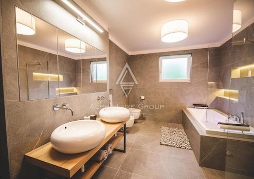 Der Außenbereich ist eine wahre Oase, mit einem üppigen Garten, einer fesselnden überdachten Sommerterrasse und einem Außenkamin, perfekt für Freizeit und Unterhaltung. Ein makelloser Swimmingpool erhöht die Anziehungskraft dieses Refugiums, umgeben von der natürlichen Schönheit der Landschaft Opatijas. Das Anwesen umfasst Parkplätze für bis zu 9 Fahrzeuge und profitiert von einem effizienten zentralen Pelletheizungssystem und einer mehrstufigen Fußbodenheizung, mit klimatisierten Räumen für ganzjährigen Komfort.