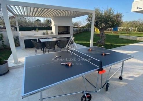 Der Hof ist von einer Mauer umgeben und verfügt über große grüne Rasenflächen und Olivenbäume. Es gibt einen großen beheizten Swimmingpool mit Liegewiese, eine Sommerküche mit Esstisch und Grill, eine Kinderschaukel mit Rutsche und Tischtennis. Hier können Sie Privatsphäre und angenehme Gesellschaft mit Ihren Lieben genießen.