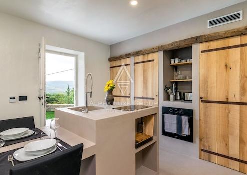 Das Haus ist ursprünglich ein klassischer Steinbau aus Istrien, der im Jahr 2015 einer kompletten Renovierung unterzogen wurde. Der Rekonstruktionsprozess umfasste die Verwendung von istrischem Stein und die Beibehaltung der traditionellen Architektur und Form des Hauses. Darüber hinaus wurde der Innenraum mit erstklassigen, maßgeschneiderten Designerstücken ausgestattet, die dem Haus ein modernes Flair verliehen. Trotz dieser Veränderungen bleibt das Wesen der ursprünglichen Struktur erhalten.