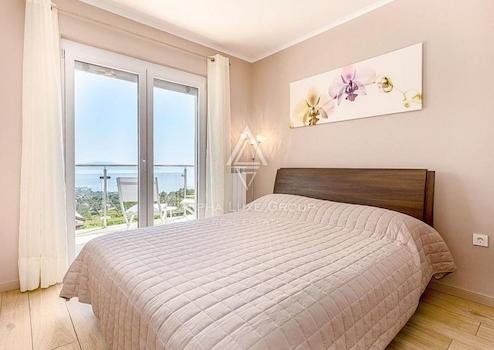 Die erste Etage der Villa erstreckt sich über eine Fläche von 99 m² und besteht aus einem Flur, drei Schlafzimmern, einem Arbeitszimmer und einem Badezimmer. Darüber hinaus verfügt die Villa über zwei Balkone und zwei Terrassen mit jeweils 19 m². Diese Außenbereiche bieten einen atemberaubenden Blick auf die Kvarner-Bucht im Süden und den Naturpark rund um den Berg Učka im Westen.