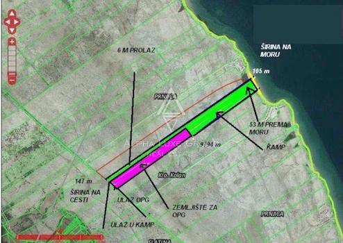 a) Kauf des gesamten Grundstücks von 134.803 m2, davon in Zone T3 ca. 14.000-16.000 m2. Das Grundstück liegt an der Autobahn Novalja - Pag zum Strand und zum Meer. Eine Süßwasserquelle auf dem Grundstück. PREIS: 2.790.000 €
