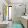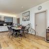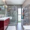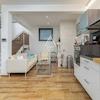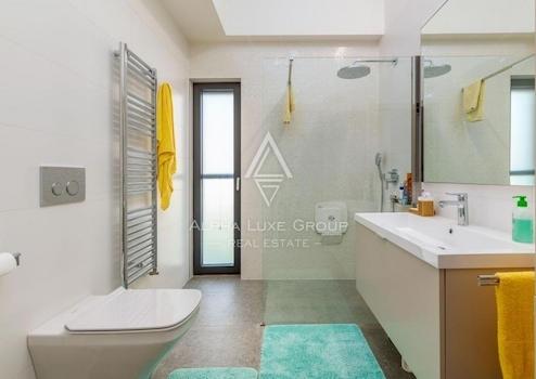 Im Erdgeschoss befindet sich ein Schlafzimmer mit Bad, ein geräumiges und schön eingerichtetes offenes Wohnzimmer mit Küche und Esszimmer sowie eine Gästetoilette. Vom Wohnzimmer aus gelangt man durch eine Glaswand auf die Außenterrasse.