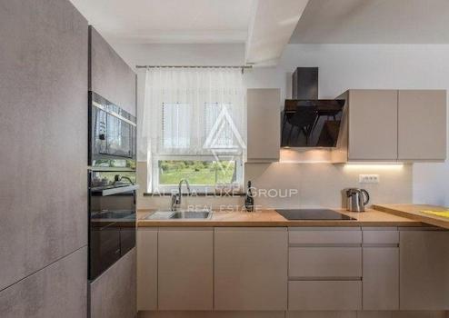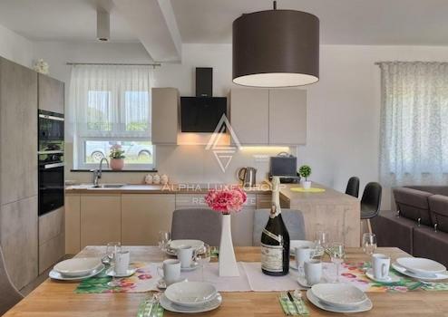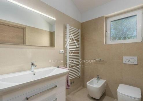 Ein Durchgang führt zur Gemeinschaftsterrasse, die einen Blick auf die istrischen Hügel und das Meer in der Ferne bietet. Die Residenz verfügt über Fußbodenheizung und ist vollständig klimatisiert.