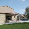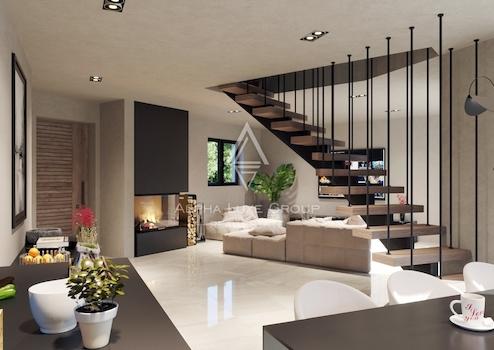 Im Erdgeschoss befindet sich ein Wohnzimmer, das durch eine Treppe von der Küche und dem Esszimmer getrennt ist und zu einer überdachten Terrasse und einem großen Swimmingpool führt. Das Erdgeschoss hat auch einen Heizungsraum, eine Toilette und ein Zimmer mit eigenem Bad. Im Obergeschoss befinden sich drei Schlafzimmer mit eigenem Bad, von denen zwei Zugang zur Terrasse haben.