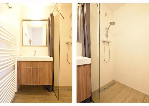 Dieses moderne en-suite Badezimmer bietet eine Kombination aus Stil und Komfort. Die geräumige Dusche mit einer eleganten Glasduschabtrennung bietet ein luxuriöses und erfrischendes Erlebnis. Das Waschbecken mit Holzunterschrank verleiht ein warmes, natürliches Gefühl, während der Spiegel darüber praktisch und elegant ist. Der Design-Heizkörper bietet behagliche Wärme und ein stilvolles Aussehen. Ein perfektes Bad, das Funktionalität und hochwertige Verarbeitung vereint.