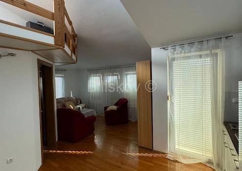 Über eine Innentreppe gelangt man ins Erdgeschoss, wo sich eine komfortable Zwei-Zimmer-Wohnung bestehend aus Flur, grossem Wohnzimmer mit Küche und Esszimmer (offenes Konzept), Schlafzimmer und Badezimmer befindet.