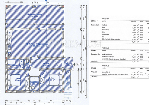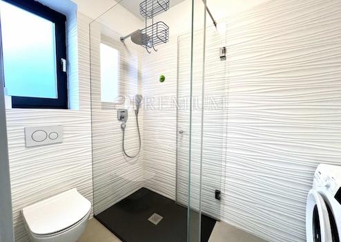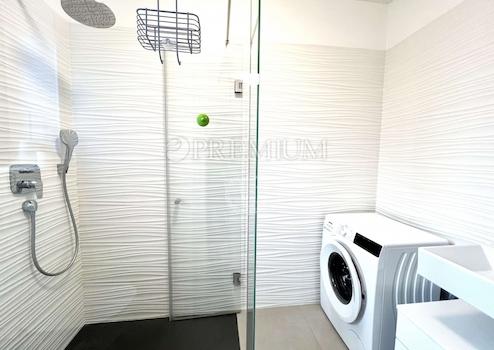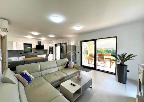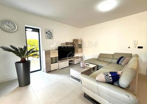 Die Wohnung befindet sich im Erdgeschoss eines Gebäudes mit nur zwei Wohneinheiten. Die Wohnfläche der Wohnung beträgt 97 m² und besteht aus einem Wohnzimmer, einer Küche, einem Esszimmer, zwei Schlafzimmern, jedes mit eigenem Badezimmer, einem weiteren Badezimmer mit WC, einer Terrasse von 30 m² und zwei Abstellräumen von 4 m² und 10 m². Die Fläche des Gartens beträgt 347 m². Im Garten befindet sich auch ein Gartenhaus. Die Wohnung ist vollständig mit hochwertiger Möbel ausgestattet, die im Preis enthalten ist. Sie hat PVC-Fenster mit Schiebeglaswänden, hochwertige Fliesen, elektrische Fußbodenheizung und alle Räume sind klimatisiert.