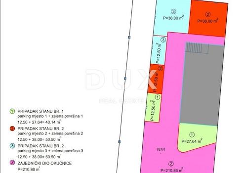 Unweit des Zentrums von Matulji, in Jušići, verkaufen wir eine Wohnung im ersten Stock bestehend aus: - Flur, - zwei (2) Schlafzimmern, - Esszimmer + Wohnzimmer, - Küche, - Badezimmer und - überdachter Terrasse, alle im Erdgeschoss, und Folgendes: – ein Lagerraum (Markierung Nr. 2), – ein Parkplatz (Markierung Nr. 2) und – Grünflächen (Markierung Nr. 2) außerhalb des Gebäudes, alle rot markiert. Die Gesamtfläche des Wohnteils beträgt 59,26 m3 und die der Nebengebäude 55,54 m3. Die Gesamtfläche des separaten Teils beträgt 114,80 m3. Die Anlage ist mit hochwertiger PVC-Tischlerei und elektrischer Fußbodenheizung ausgestattet. Die Mehrwertsteuer ist im Preis enthalten, sodass der zukünftige Käufer beim Erwerb der Immobilie keine Steuern zahlt.