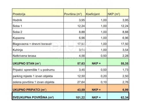 Nicht weit vom Zentrum von Matulji, in Jušići, verkaufen wir eine Wohnung im Erdgeschoss bestehend aus: - Flur, - zwei (2) Schlafzimmern, - Esszimmer + Wohnzimmer, - Küche, - Badezimmer und - überdachter Terrasse, alles auf Im Erdgeschoss befinden sich: - ein Lagerraum (Markierung Nr. 1), - ein Parkplatz (Markierung Nr. 1) und - eine Grünfläche (Markierung Nr. 1) außerhalb des Gebäudes, grün markiert. Die Gesamtfläche des Wohnteils beträgt 57,63 m², die Nebenfläche 43,59 m². Die Gesamtfläche des Sonderteils beträgt 101,22 m². Die Anlage ist mit hochwertiger PVC-Tischlerei und elektrischer Fußbodenheizung ausgestattet. Die Mehrwertsteuer ist im Preis enthalten, sodass der zukünftige Käufer beim Erwerb der Immobilie keine Steuern zahlt.