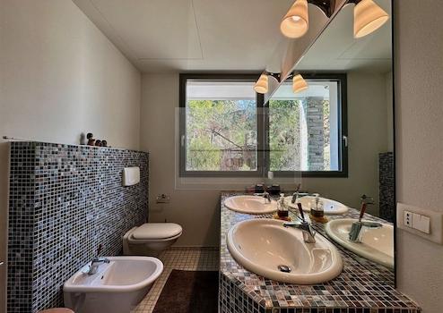 Der Schlafbereich ist über einen schönen, von LED-Scheinwerfern beleuchteten Flur zugänglich, der zum großen Mosaikbad "Bisazza" mit Teuco-Dusche und Doppelwaschbecken führt;