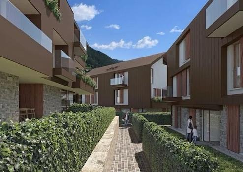 Das Borgo Val di Sole besteht aus fünf Häusern, die so ausgerichtet sind, dass jede Wohnung den Blick auf die Berge und die Privatsphäre garantiert.