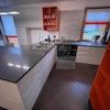 - die offene Küche mit Halbinseltisch, individuell eingerichtet, mit großem Balkon;