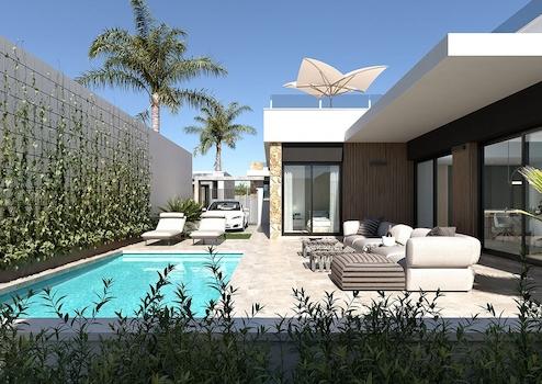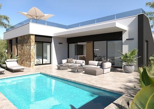 Eingeschossige Villen mit 3 Schlafzimmern, 2 Bädern, Dachterrasse, Einbauküchen mit Elektrogeräten, Klimaanlage, Kfz-Stellplatz und Privatpool