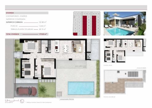 Die reizvolle Wohnanlage in Ciudad Quesada besteht aus 50 modernen ein- und zweigeschossigen Villen mit 3 Schlafzimmern und 2 bis 3 Bädern. Die Villen haben großzügige Dachterrassen sowie Privatpools und Kfz-Stellplätze auf dem eigenen Grundstück.