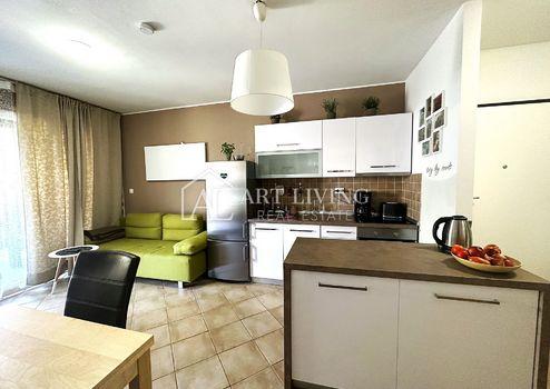Die Wohnung mit einer Gesamtfläche von 47 m2 besteht aus einem Wohnzimmer, einer Küche und einem Esszimmer nach dem „Open Space“-Prinzip, einem Badezimmer, zwei Schlafzimmern und einer großzügigen überdachten Terrasse mit direktem Zugang zu einem wunderschön angelegten Garten von ca 100 m2.
