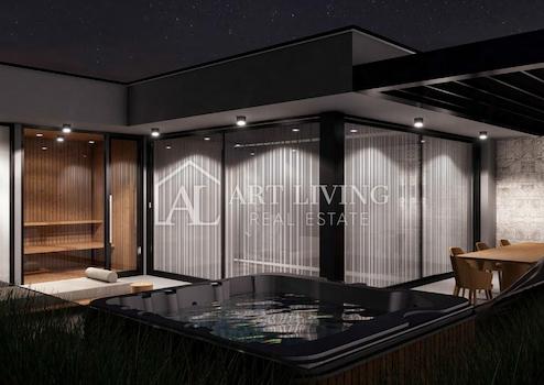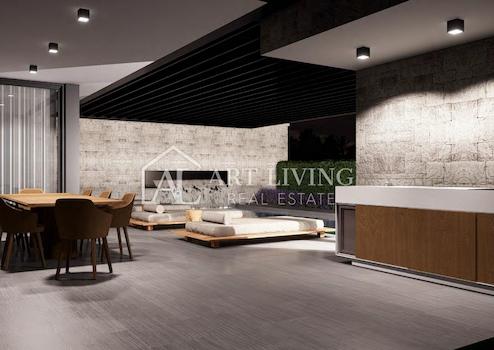 Wir steigen über die Außentreppe in den zweiten Stock hinauf, der aus einem Abstellraum, einem Badezimmer, einem offenen Raum zum Entspannen und einer Küche besteht, die Zugang zu einer Terrasse mit Esstisch, einer überdachten bioklimatischen Pergola sowie einem hat Liegewiese, Whirlpool, Fitnessraum und Sauna. Die Dachterrasse bietet einen wunderschönen Blick auf das Meer und die bezaubernde Landschaft Istriens