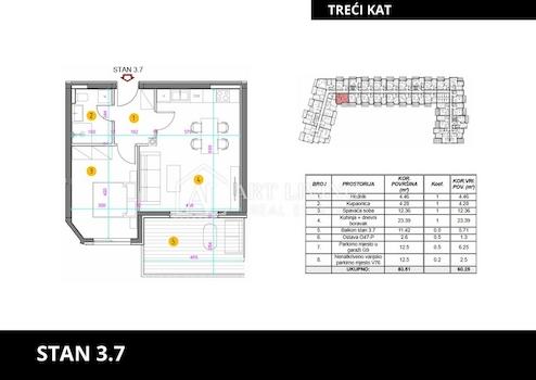Die Wohnung befindet sich im 3. Stock eines modernen Neubaus mit Aufzug. Die Gesamtfläche der Wohnung beträgt 60,25 m2. Sie besteht aus einem Wohnzimmer mit Küche und Esszimmer, einem Badezimmer und einem Schlafzimmer. Vom Wohnzimmer aus gelangt man auf einen 11,42 m2 großen Balkon. Zur Wohnung gehören ein Abstellraum, ein Garagenstellplatz und ein nicht überdachter Außenstellplatz.