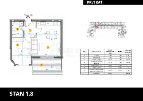 Die Wohnung befindet sich im 1. Stock eines neuen, modernen Gebäudes mit Aufzug. Die Gesamtfläche der Wohnung beträgt 54,19 m2. Es besteht aus einem Wohnzimmer mit Küche und Esszimmer, einem Badezimmer und einem Schlafzimmer. Das Wohnzimmer führt zu einem Balkon von 11,42 m2. Die Wohnung verfügt über einen Abstellraum und einen Außenparkplatz.