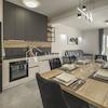Das Erdgeschoss besteht aus einem Flur, einem Wohnzimmer mit offener Küche und Esszimmer, zwei Schlafzimmern mit Bad und einer Innentreppe zum ersten Stock.