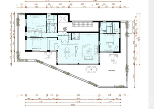 Die Wohnung hat eine Fläche von 211 m2 und besteht aus einem Flur, einem geräumigen Wohnzimmer mit offener Küche und Esszimmer, drei Schlafzimmern mit eigenen Bädern und Kleiderschränken, einer Toilette und einem Abstellraum.