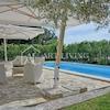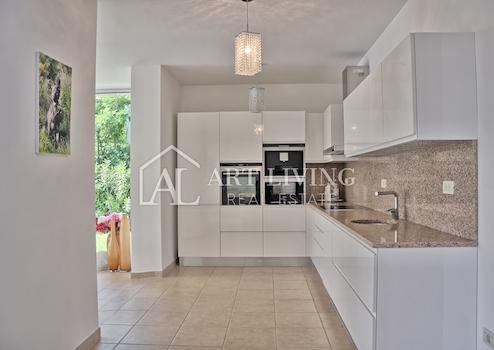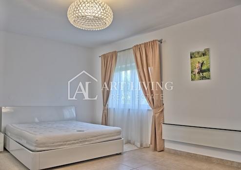 Im Erdgeschoss der Villa befindet sich ein geräumiges Wohnzimmer mit Kamin, ein Esszimmer und eine offene Küche, ein Schlafzimmer mit einem Badezimmer und einer Toilette. Vom Wohnzimmer gibt es einen direkten Zugang zur Terrasse mit Swimmingpool und Liegewiese.