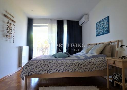Im ersten Stock gibt es einen Abstellraum und zwei Schlafzimmer mit eigenem Bad und Zugang zur Terrasse mit Panoramablick auf das Meer und die Bucht von Piran.