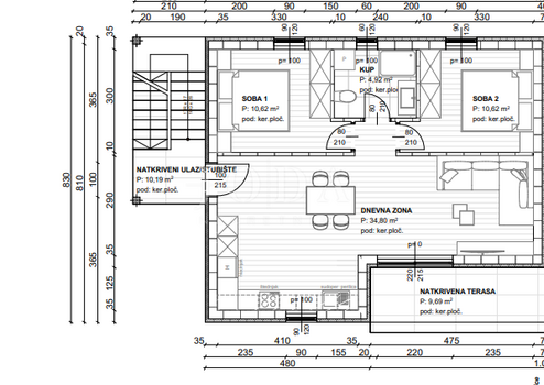 Die Wohnung im zweiten Stock erstreckt sich über 80,84 m² und umfasst zwei Schlafzimmer, jeweils 10,62 m², ein Wohnzimmer mit einer Fläche von 34,80 m², ein Badezimmer (4,92 m²) sowie eine Terrasse mit überdachtem Eingang.