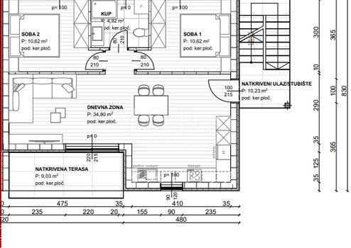 Die Wohnung erstreckt sich über 80,84 m². Das Interieur umfasst zwei Schlafzimmer von je 10,62 m², ein Wohnzimmer mit 34,80 m², ein Badezimmer (4,92 m²), eine Terrasse und einen überdachten Eingang.