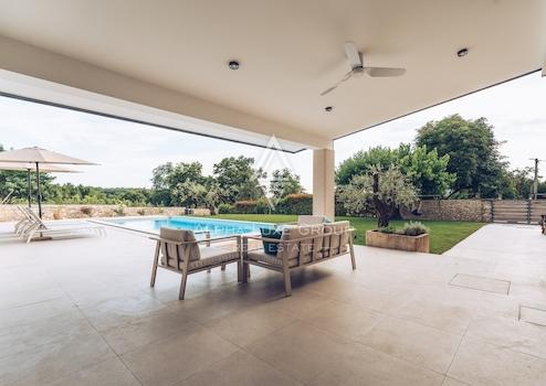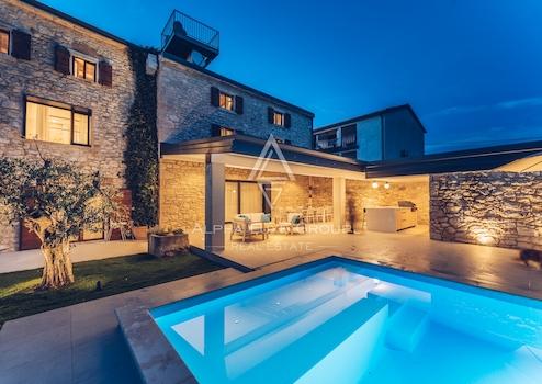 In einer ruhigen Gegend nahe Novigrad befindet sich diese wunderschöne Steinvilla, die Privatsphäre und modernen Luxus vereint. Auf einem 861 m² großen Grundstück verfügt die Immobilie über einen angelegten Garten mit Sommerküche, Sauna und beheiztem Infinity-Pool. Die Villa erstreckt sich über 312 m² auf drei Etagen. Im Erdgeschoss befinden sich ein Wohnzimmer mit Galerie, eine voll ausgestattete Küche mit Essbereich und ein Gästebad.