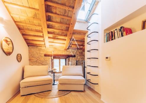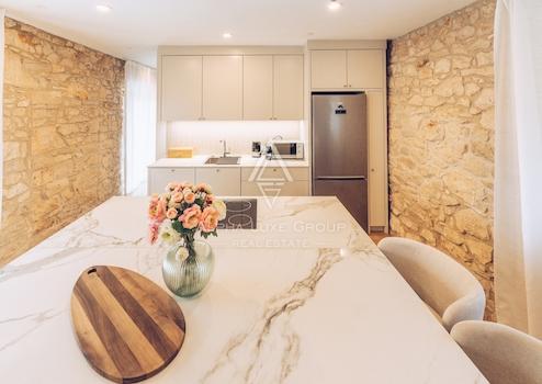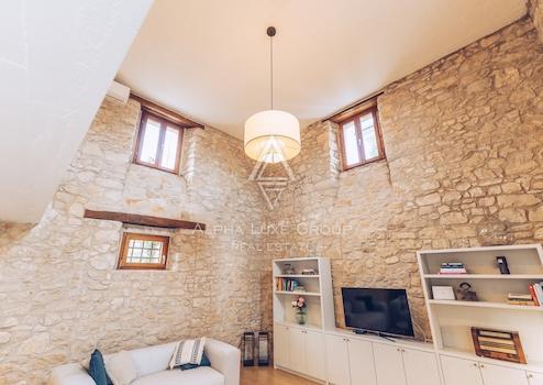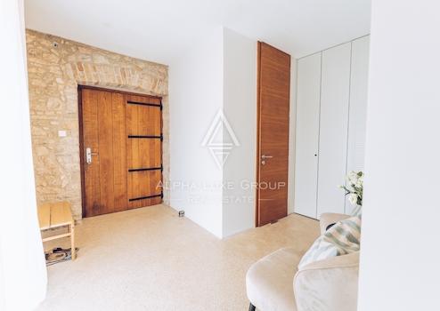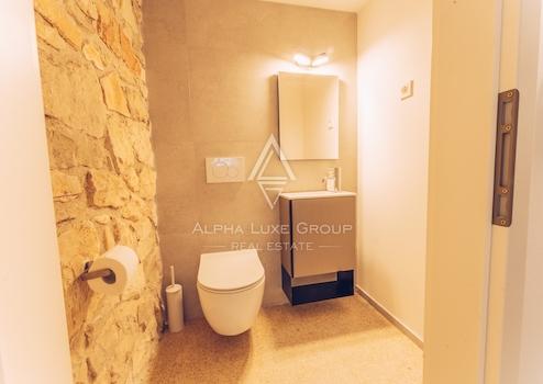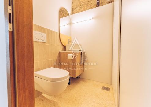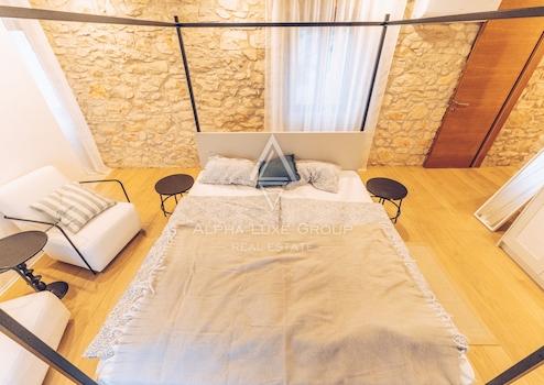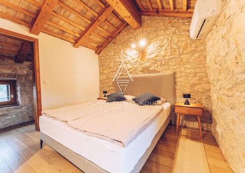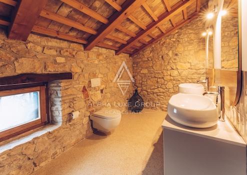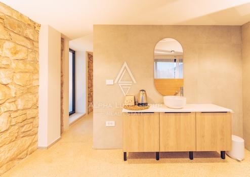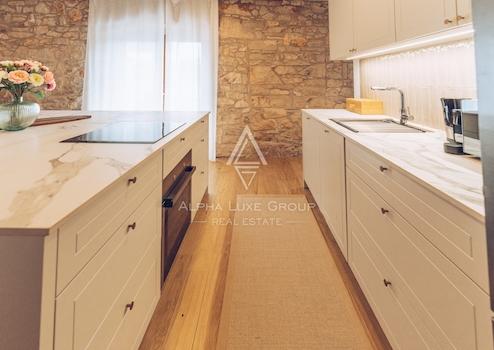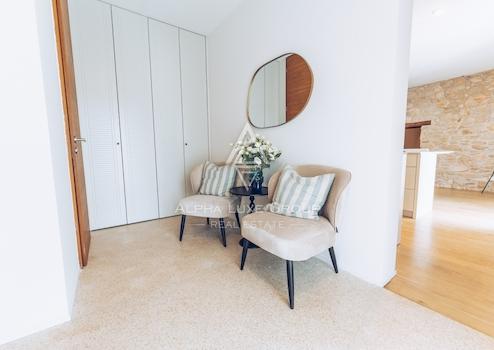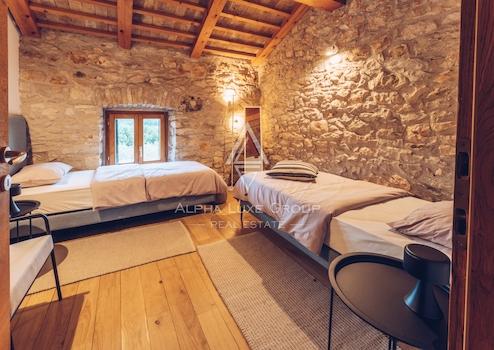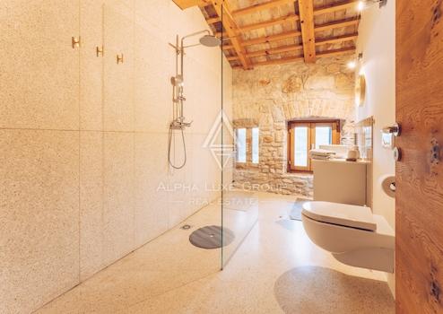 Im ersten Stock gibt es ein Hauptschlafzimmer mit eigenem Bad und Blick auf das Grün, den Pool und das Meer. Das Dachgeschoss umfasst drei weitere Schlafzimmer und zwei Badezimmer, was die Villa ideal für Familien oder Gäste macht. Die Villa wurde kürzlich mit originalen Stein- und Holzelementen renoviert, die zusammen mit modernen Annehmlichkeiten wie einer Fußbodenheizung einen einzigartigen Wohnkomfort bieten.