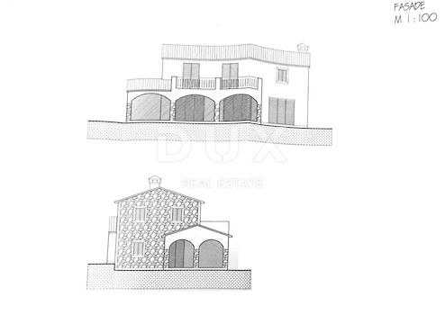 An der Südostküste Istriens, wo grüne Hügel auf das Meer treffen, wo Natur und Kulturerbe aufeinandertreffen, liegen nur vier Kilometer voneinander entfernt zwei Städte ähnlicher Größe mit unterschiedlichem, aber sich ergänzendem Charakter – Labin und Rabac. Rabac wird aufgrund seiner weißen Kieselstrände, der üppigen mediterranen Vegetation und des kristallklaren Meeres als Perle der Kvarner-Bucht bezeichnet. Rabac war einst ein kleines Fischerdorf und ist heute ein attraktives Touristenziel, das in seinem Netz aus malerischen Straßen eine Fülle kultureller Veranstaltungen birgt. Die grüne Umgebung und das malerische Hinterland von Rabac laden das ganze Jahr über zu Abenteuern, Erkundungen und Erholung ein. In der Nähe von Rabac und Labin steht ein im Bau befindliches Haus mit Meerblick zum Verkauf. Es liegt in einem ruhigen Viertel mit Ferienhäusern und Einfamilienhäusern und bietet die perfekte Balance zwischen ländlicher Umgebung und Nähe zum Meer und städtischen Annehmlichkeiten. Der zeitlose Entwurf des Hauses fügt sich in Form und Farbigkeit in die Siedlung und Landschaft ein. Es ist als eine Wohneinheit konzipiert, die sich über zwei Etagen erstreckt. Das Erdgeschoss besteht aus einem offenen Raumkonzept, das Küche, Esszimmer und Wohnzimmer mit Zugang zu einer überdachten Terrasse, Gästetoilette, Hauswirtschaftsraum, Abstellraum und Flur vereint. Der erste Stock besteht aus einem Flur, drei Schlafzimmern, zwei Bädern und einer Terrasse. Der angegebene Preis bezieht sich auf den auf den Fotos erkennbaren Zustand; rohbau Errichtung eines Wohngebäudes bis zur Rohbauphase. Die hervorragende Lage und die räumliche Aufteilung des Innen- und Außenbereichs dieser Immobilie bieten die Möglichkeit für ein komfortables Familienleben oder eine Investition in ein touristisches Vermietungsgeschäft.