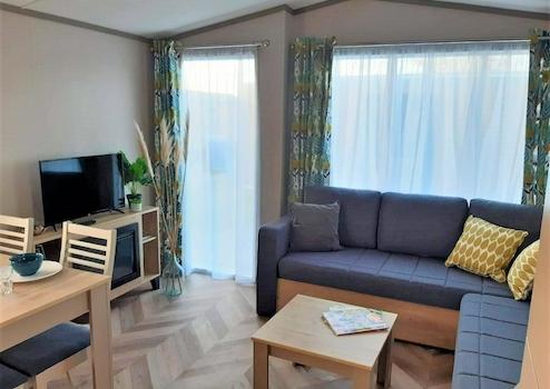 Auf der linken Seite des Chalets befindet sich das geräumige Wohnzimmer, das mit einem Ecksofa ausgestattet ist und Platz für die ganze Familie bietet. Durch die vielen Fenster wirkt der Raum offen und luftig, wobei das Licht wunderbar hereinströmt. Zusätzlich ist das Wohnzimmer mit einem Couchtisch und einem TV-Schrank mit den notwendigen Anschlüssen für all Ihre Geräte ausgestattet, sodass Sie jederzeit entspannen und Ihre Freizeit in vollen Zügen genießen können.