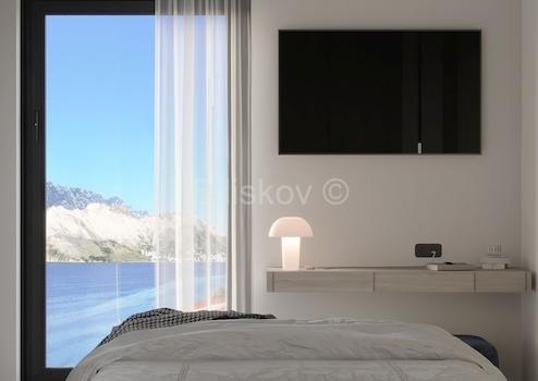 Die Wohnung besteht aus einem Eingangsbereich, einem geräumigen, offen gestalteten Wohnbereich mit Küche und einer Schiebetür, die einen unvergleichlichen Panoramablick auf das Meer bietet, einer Terrasse mit Zugang zum Pool, zwei Schlafzimmern, einem Badezimmer und einem separaten WC.