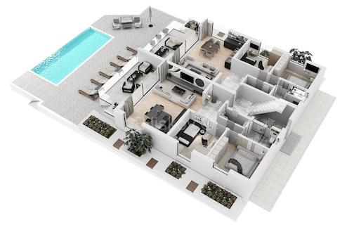 Die Villa verfügt über einen gemeinschaftlichen Pool von 39 m², Poolbereich mit Ausstattung (Liegestühle, Stühle, Dusche), direkten Strandzugang, Videoüberwachung des Grundstücks und 4 Parkplätze.